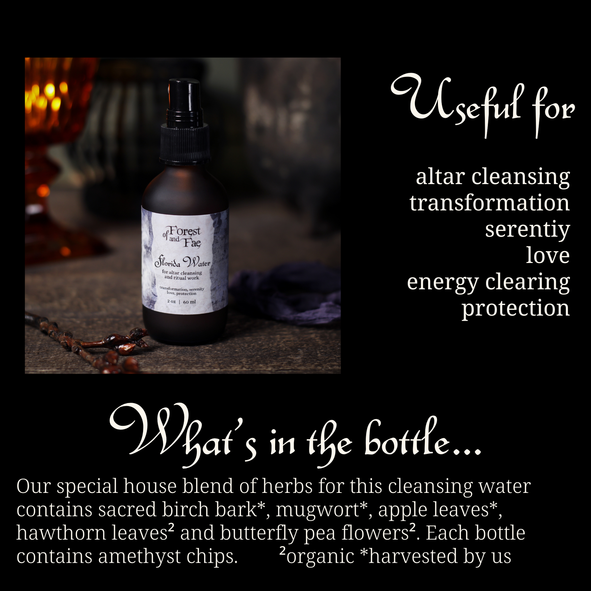 Traditionally used for spiritual cleansing and blessing, Florida Water is a staple in many folk magic practices. It can be used to cleanse your altar, tools, hands, or energetic field before ritual work, or lightly misted through your space as an alternative to smoke cleansing.