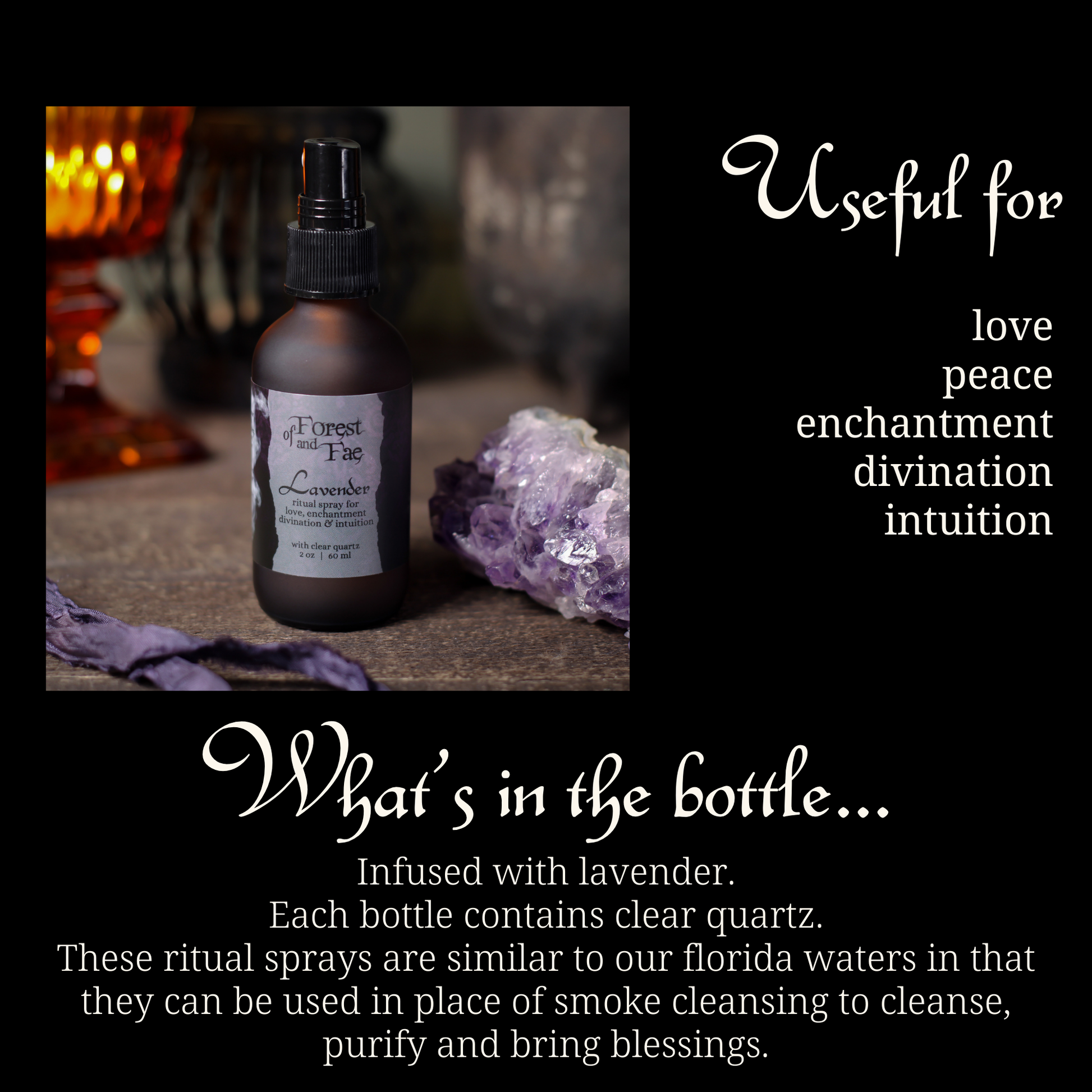 These ritual sprays are similar to our florida waters in that they can be used in place of smoke cleansing to cleanse, purify and bring blessings.