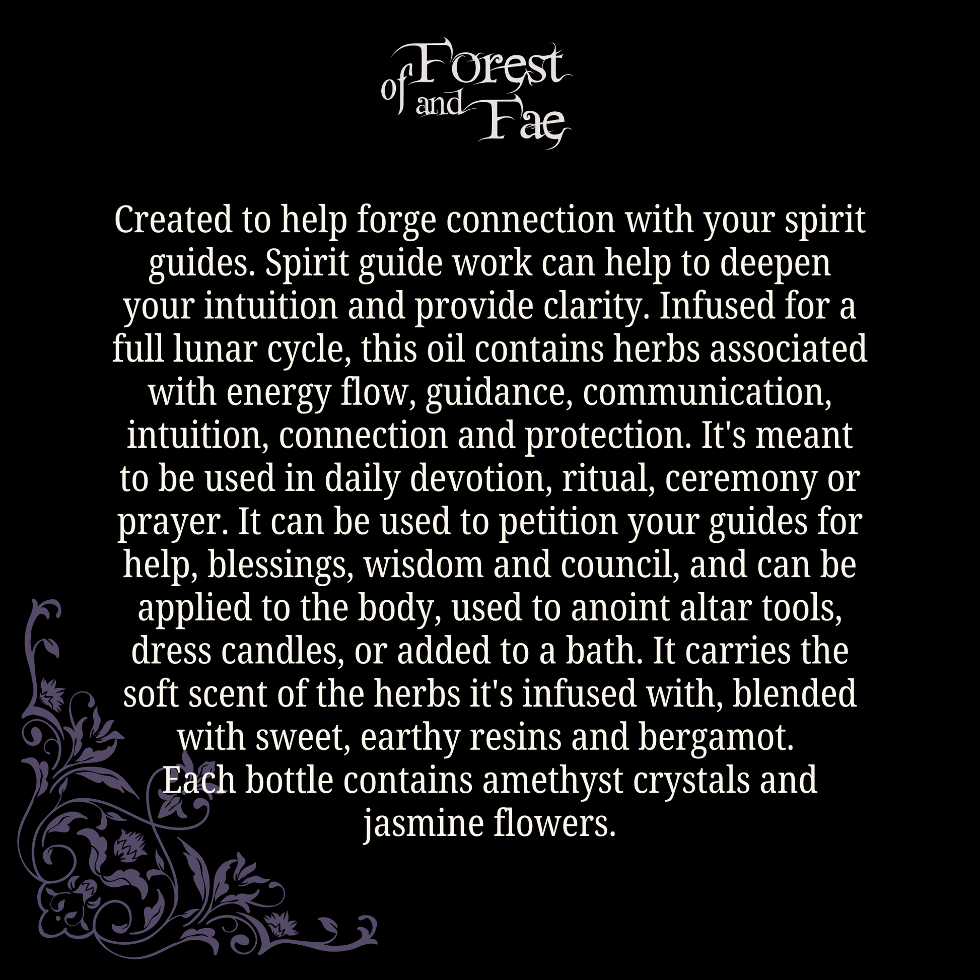 Created to help forge connection with your spirit guides. Spirit guide work can help to deepen your intuition and provide clarity. Infused for a full lunar cycle, this oil contains herbs associated with energy flow, guidance, communication, intuition, connection and protection. It's meant to be used in daily devotion, ritual, ceremony or prayer. It can be used to petition your guides for help, blessings, wisdom and council, and can be applied to the body, used to anoint altar tools, dress candles, or added to a bath. It carries the soft scent of the herbs it's infused with, blended with sweet, earthy resins and bergamot. Each bottle contains amethyst crystals and jasmine flowers.
