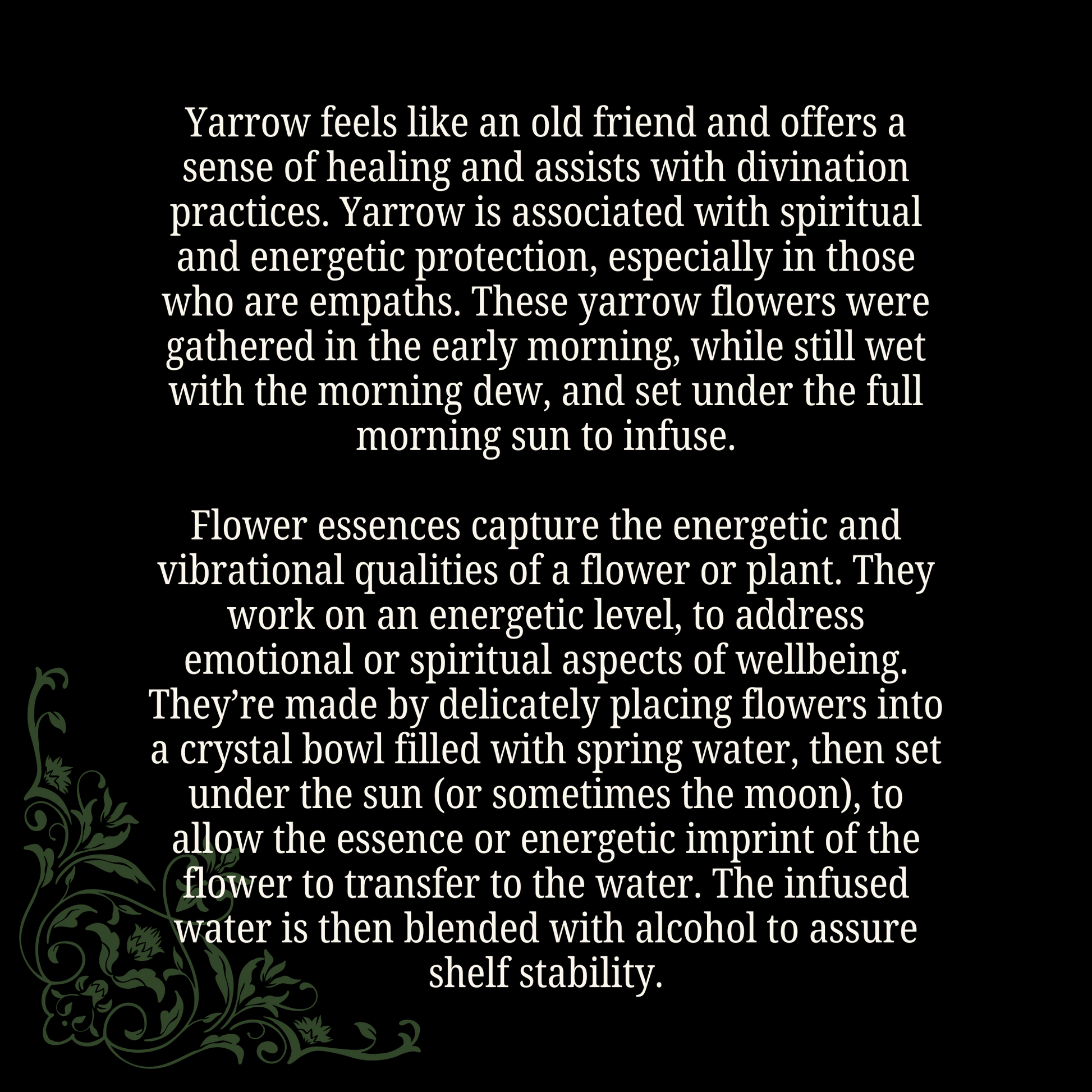 Flower essences are energy magick. Yarrow feels like an old friend, and offers a sense of healing and energetic protection. These yarrow flowers were gathered in the early morning, while still wet with the morning dew, and set under the full morning sun to infuse.
